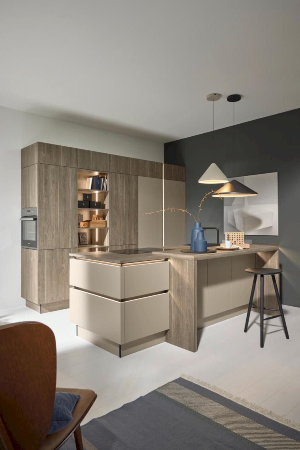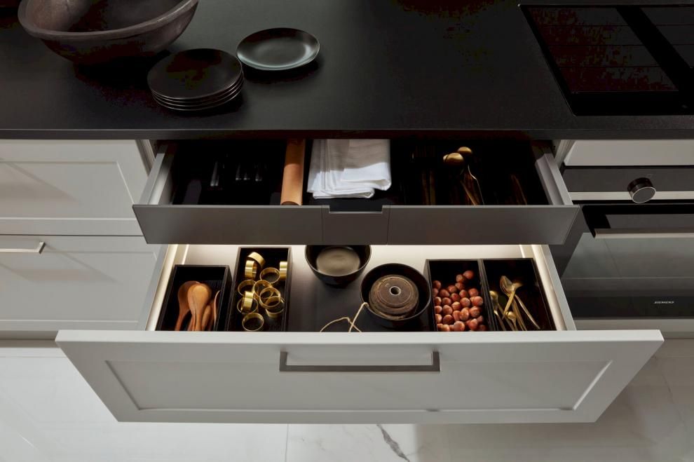 Avec une cuisine de campagne, on peut toujours en faire un peu plus. Vous pouvez donc opter pour des portes cadre. Cela passera du cadre large au cadre plus fin et du panneau central lisse aux rainures supplémentaires. Tout est permis ! Vous possédez une belle vaisselle à exposer ? Nous lui donnerons une belle place derrière une vitrine de grande classe, qui est également entièrement personnalisable à votre goût.