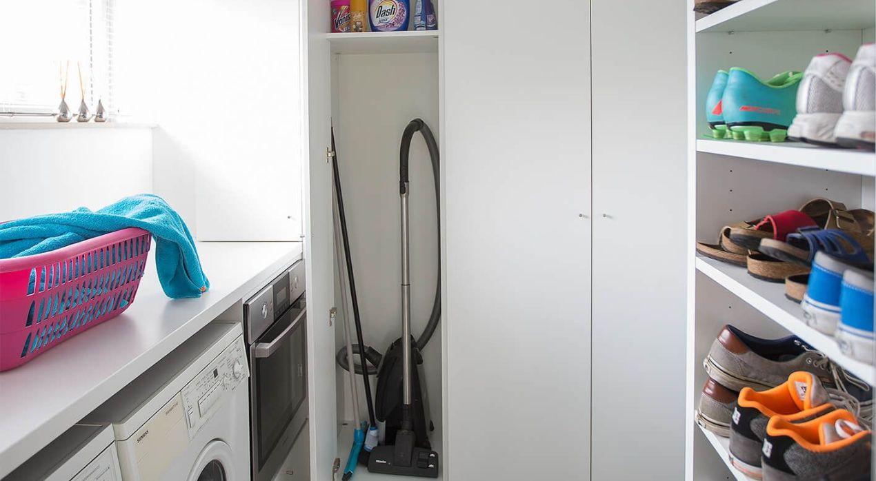 Nous pensons également à l'ergonomie. Nous concevons l'intérieur de votre buanderie pour que la machine à laver et le sèche-linge puissent être placés à une hauteur adaptée pour vous. Plus besoin de s'agenouiller pour charger le linge. En outre, nous pensons également à un espace de rangement accessible pour la planche et le fer à repasser.