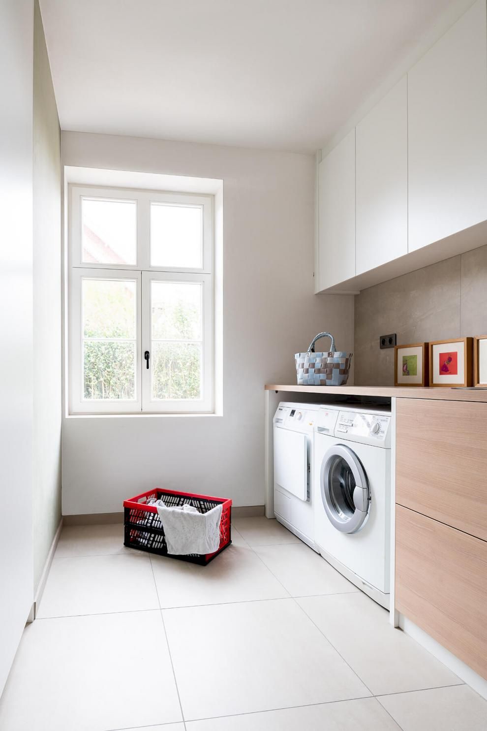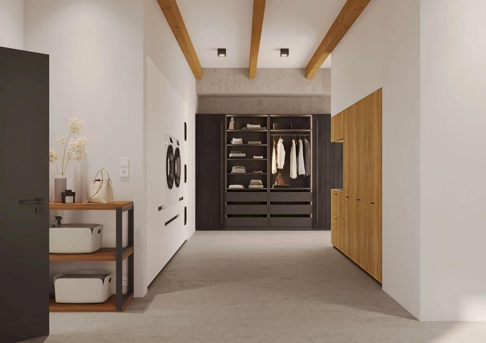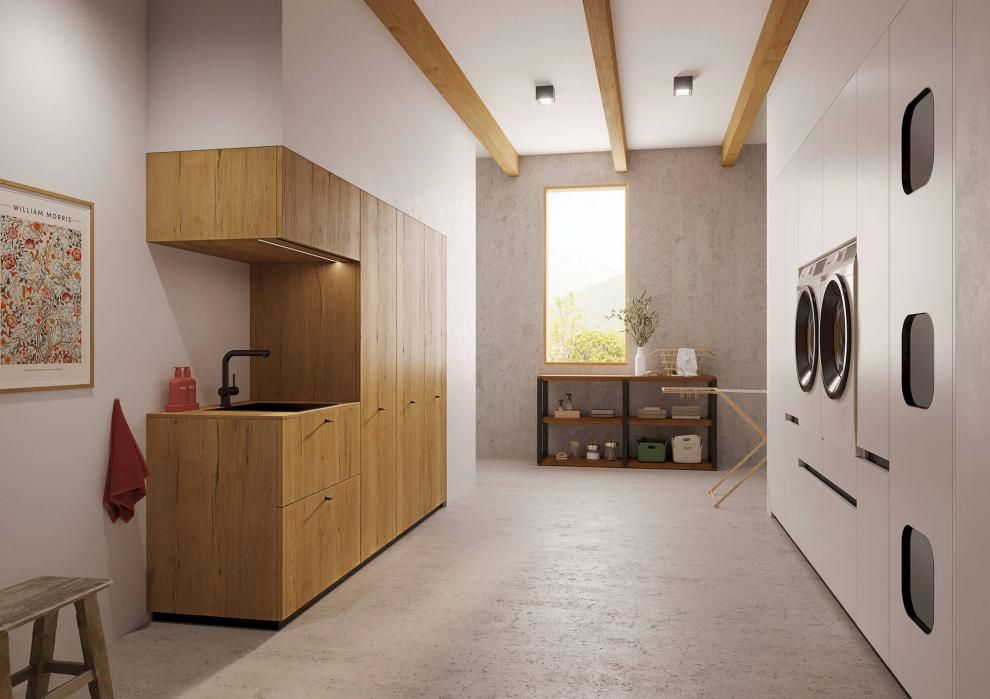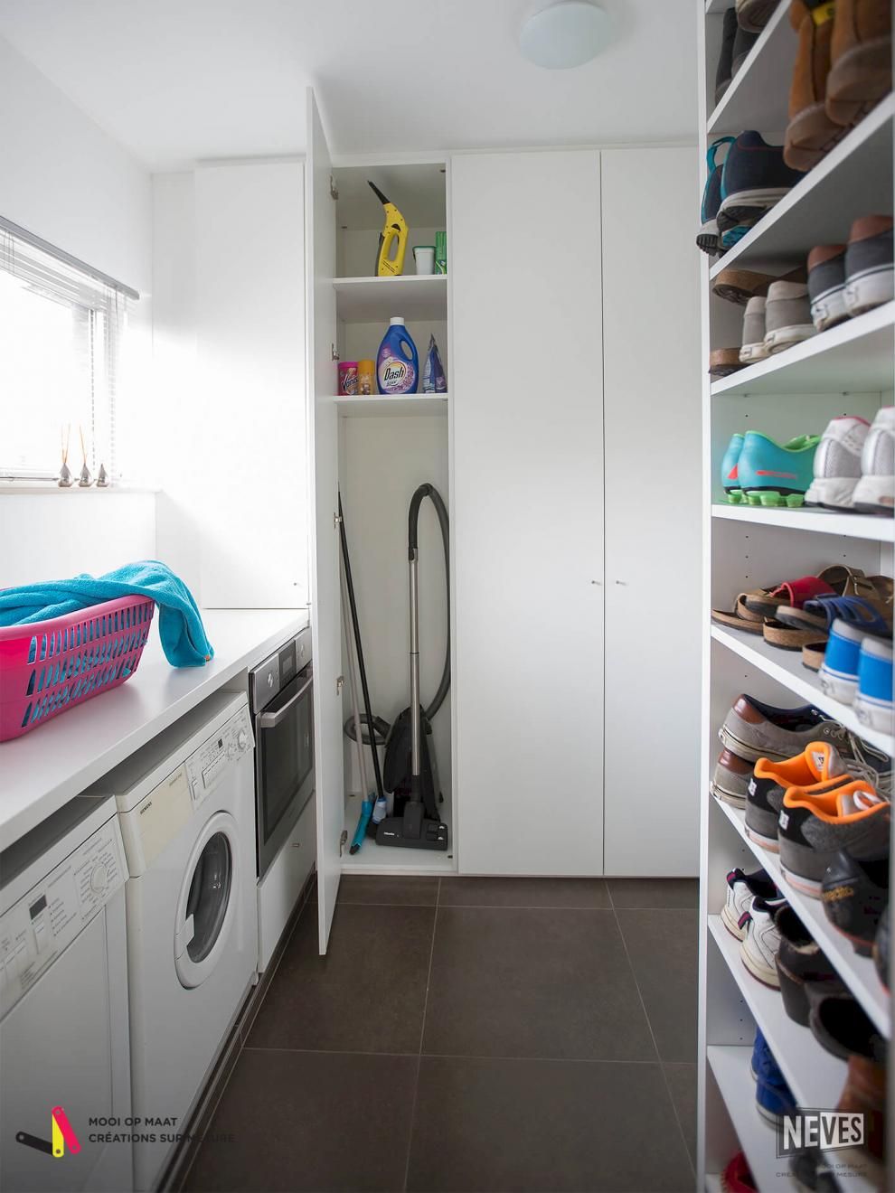 Ook wij denken aan ergonomie. We ontwerpen jouw berging inrichting zo, dat wasmachine en droogkast op gemakkelijke hoogte geplaatst kunnen worden. Gedaan met op de knieën te liggen voor de was in te laden. Daarnaast denken we ook aan een opbergruimte voor de strijkplank en het strijkijzer eenvoudig in te plaatsen.