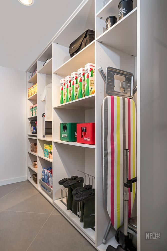 Wanneer de berging vlakbij de keuken ligt kan deze perfect gebruikt worden als voorraadkamer. Ideaal voor het stockeren van voedingswaar, bakken met drank, onderhoudsproducten… Zelfs vuilbaksystemen krijgen hier een plekje uit het zicht.